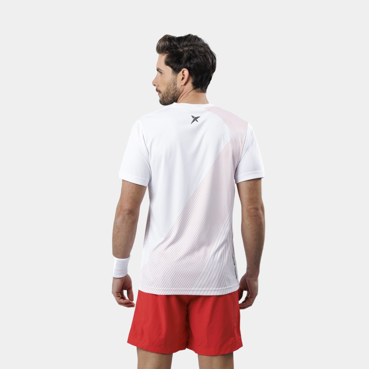 En cuanto a su estética, la nueva línea de Juan Martín Díaz sale al mercado con un aire juvenil y alegre. La Camiseta Drop Shot Airam JMD Blanco destaca por su elegante y distinguido diseño. Líneas geométricas en color rojo detallan la prenda dotándola de una personalidad única. En la parte del pecho de la prenda se incorpora el logo de Drop Shot y de la línea JMD a través de 3D rubber print.