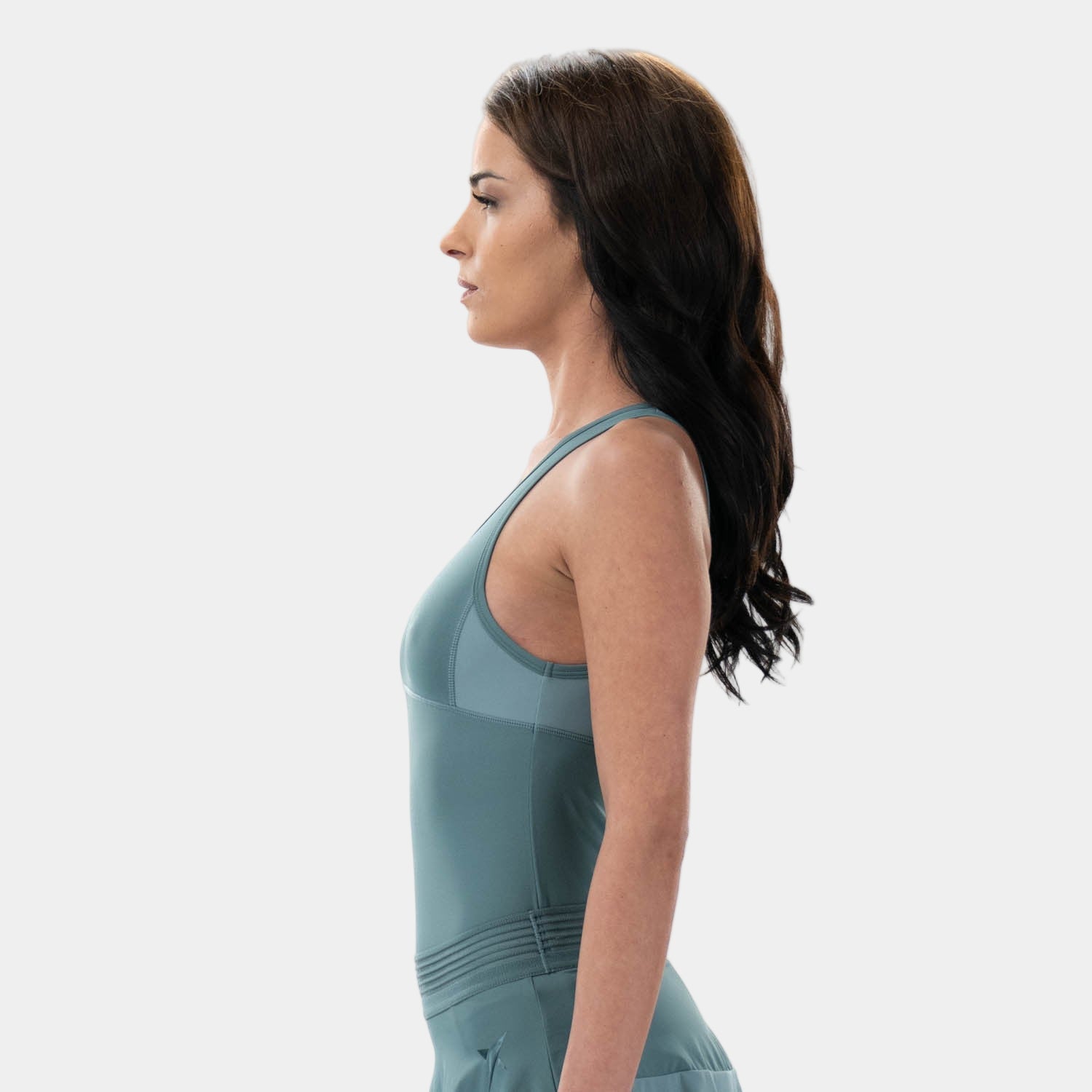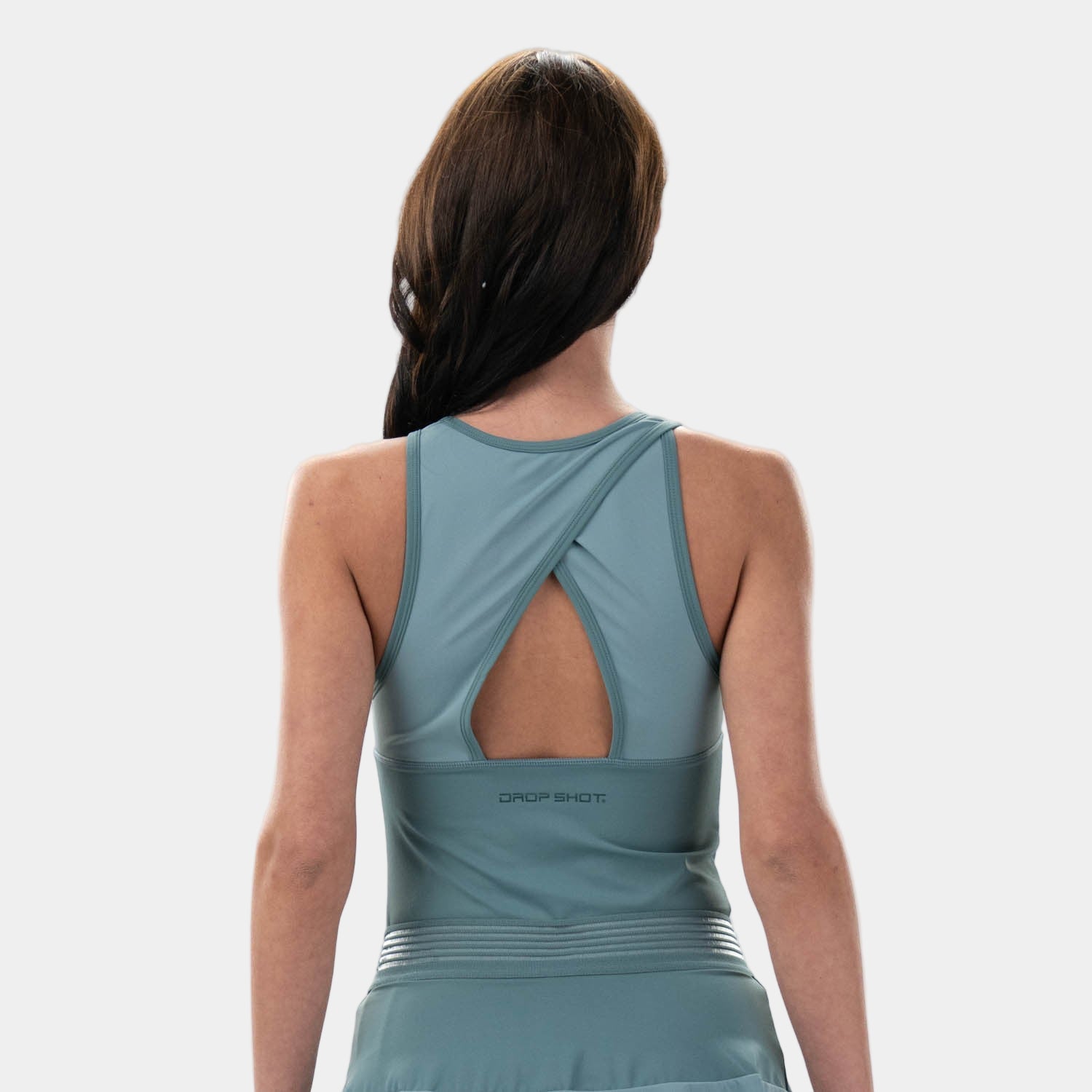 La prenda destaca por el corte de la parte trasera, la cual luce un elegante cruce en tejido Mesh que deja visible un trozo de espalda. Sin duda, los detalles son lo que convierten a la prenda en única ya que el nombre de Drop Shot se estampa en un acabo de espejo que llama la atención a simple vista.