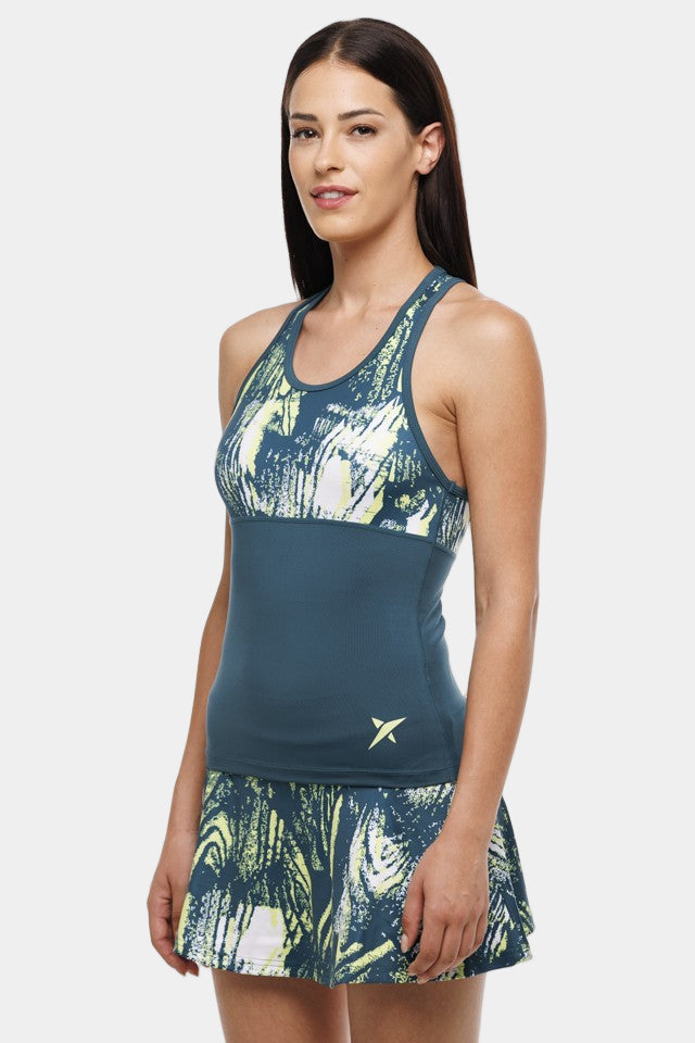 La estética que define a la Camiseta Drop Shot Famara, se caracteriza por ser atrevida y moderna. Incorpora un diseño estampado en su parte superior, que combina con el tono verde mostrando un diseño rompedor. Se ha confeccionado a partir de un patrón de espalda y cuello mariposa; y para rematar se ha impreso en silicona 3D el logo y nombre de la marca.