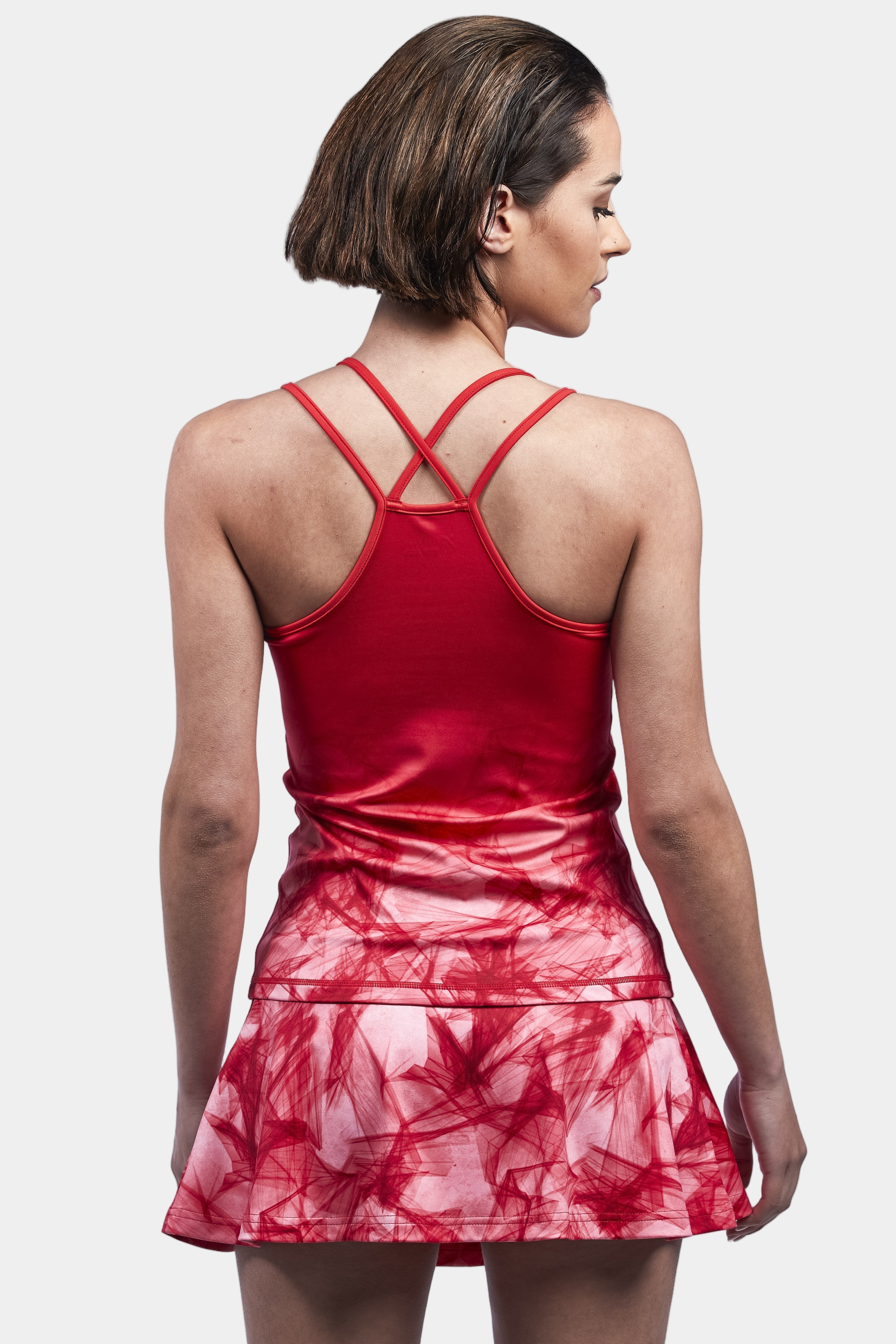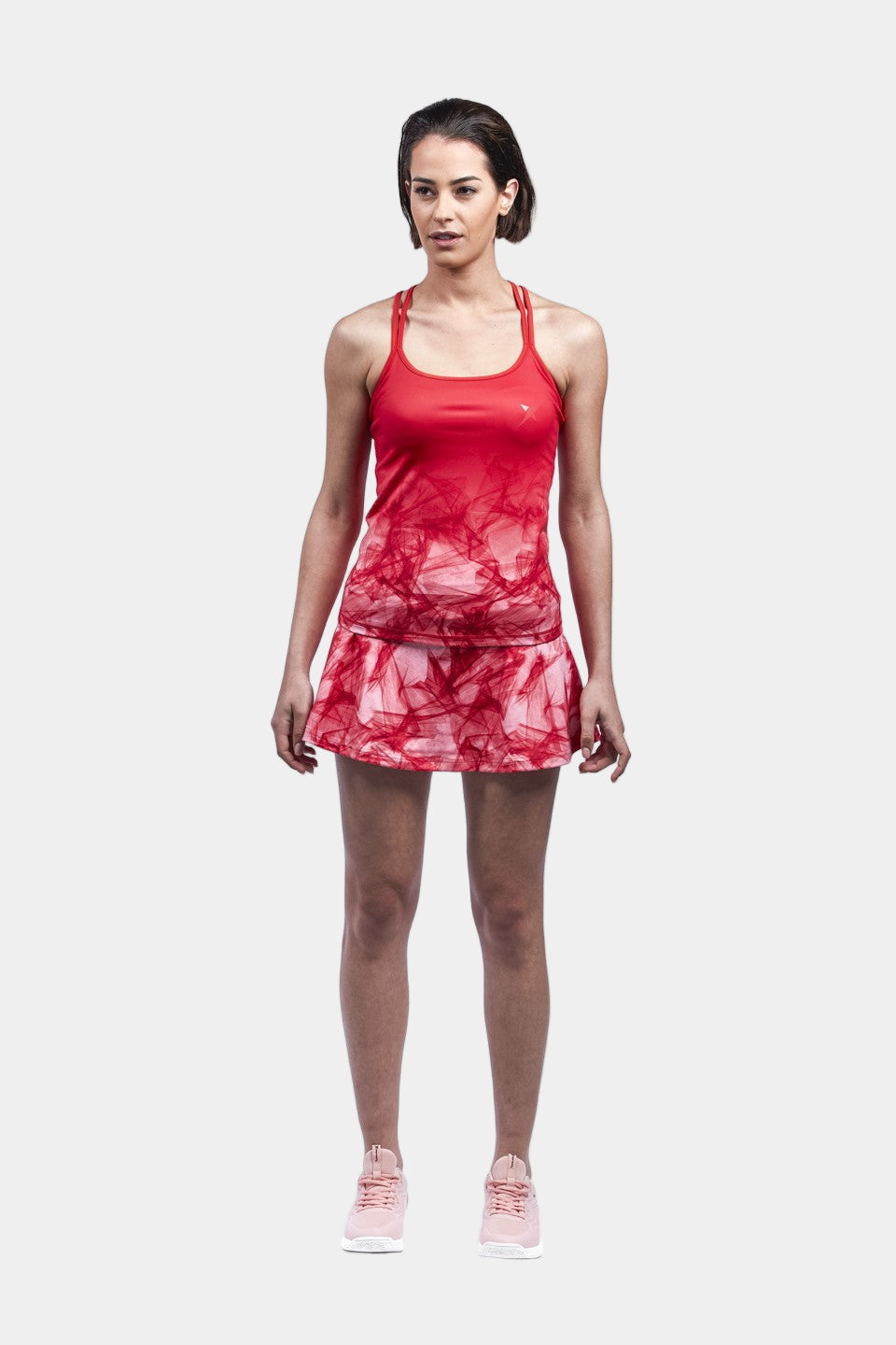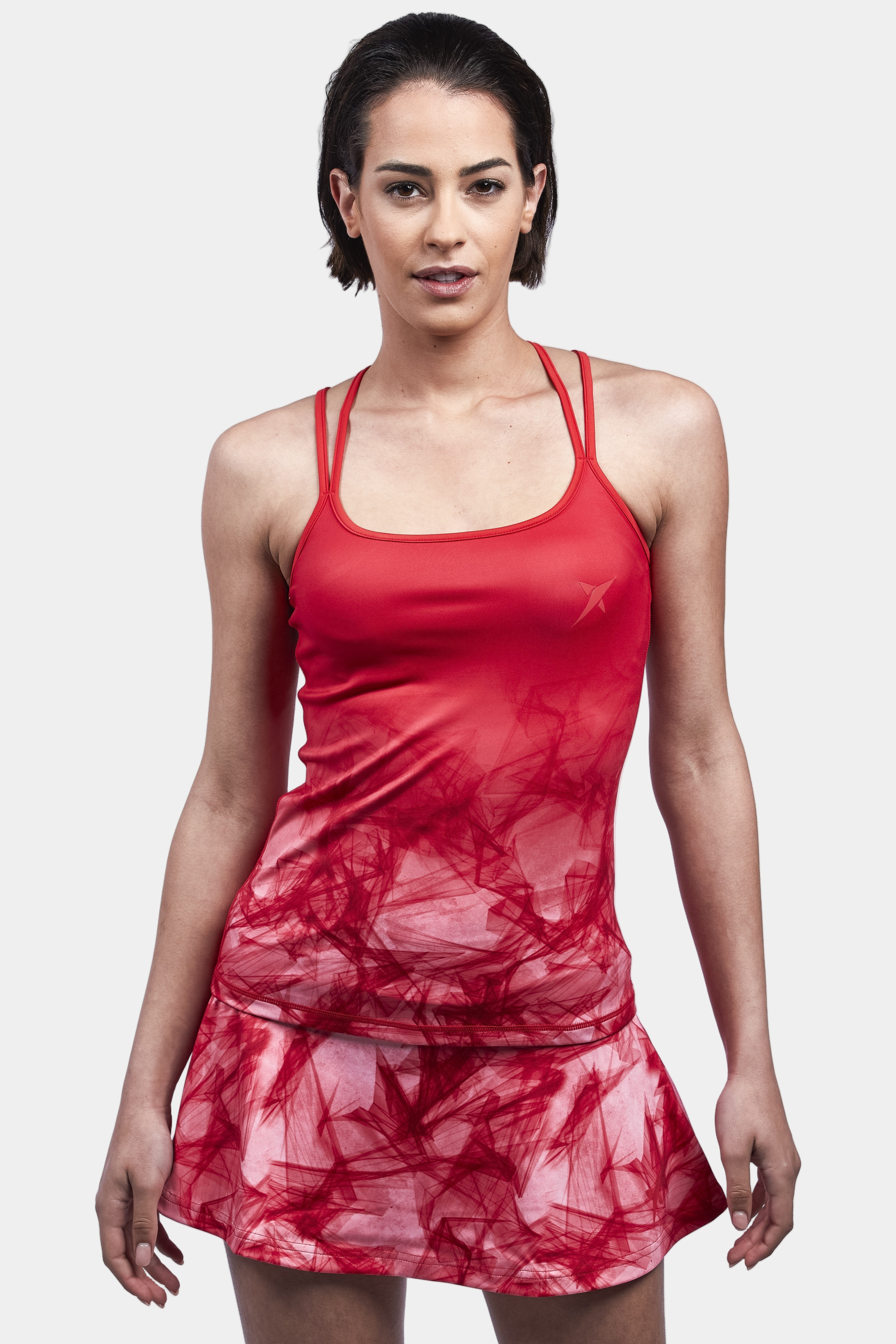 En la nueva colección de textil de pádel Drop Shot encontramos la camiseta de pádel Lyra, un modelo de tirantes en color rojo con detalles en blanco y un diseño innovador en la parte posterior.