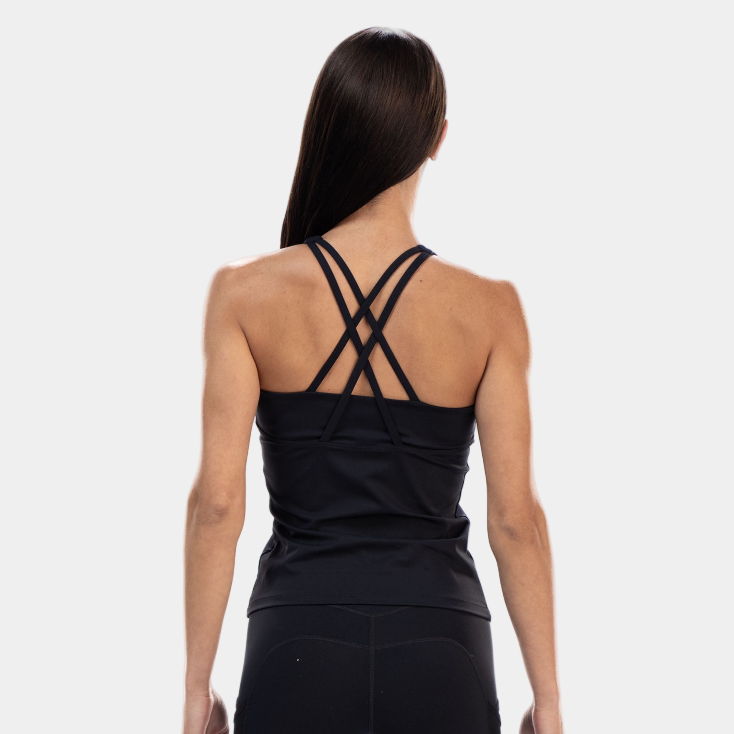 En cuanto a su diseño, lo principal a destacar es el corte de tirantes cruzados de su espalda, lo que estiliza el cuerpo y aporta un carácter único. La camiseta es de color negro para facilitar la combinación con múltiples prendas, permitiendo crear diferentes outfits.