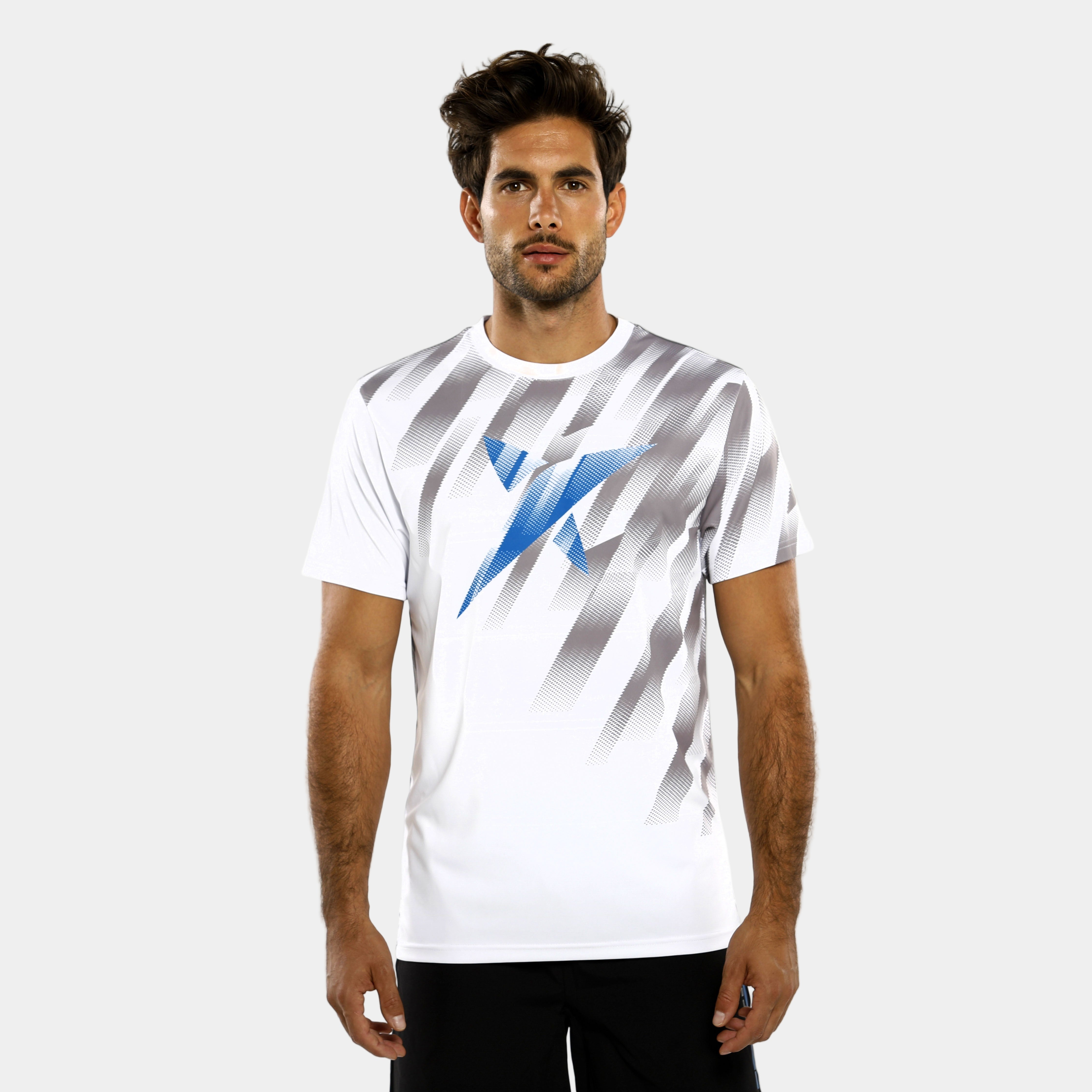 Una Camiseta Drop Shot Zero 2021 que cuenta con un elegante diseño donde el blanco aporta la deportividad, el gris en formas y texturas suma la elegancia y los detalles en azul aportan un extra de vistosidad.