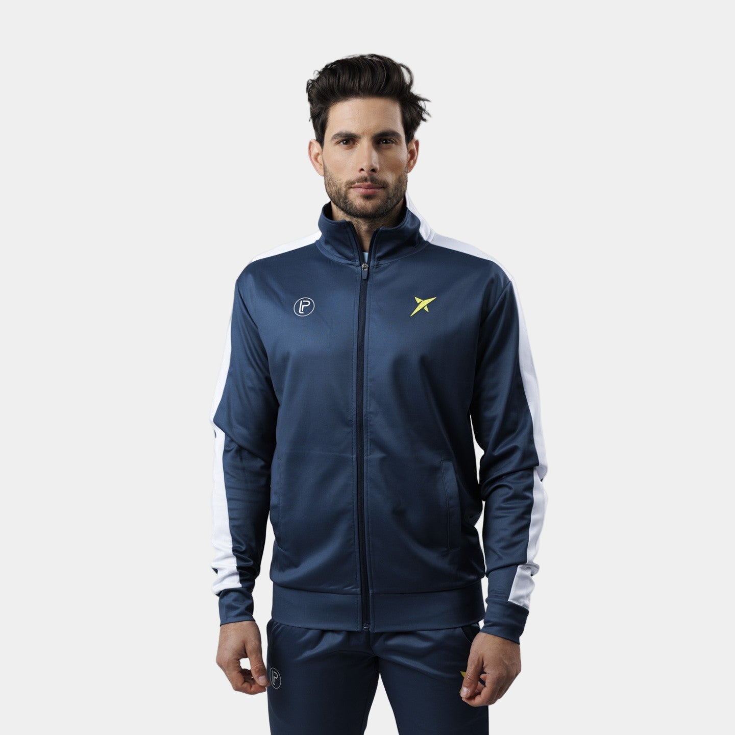 Ambas partes lucen un tono azul marino que se detalla con la sublimación en 3D rubber print en tonos blancos y amarillos del logotipo y nombre de la marca, así como de la línea de Pablo Lima. La prenda toma carácter a través de una línea lateral en tonos blancos que recorre la chaqueta y el pantalón.