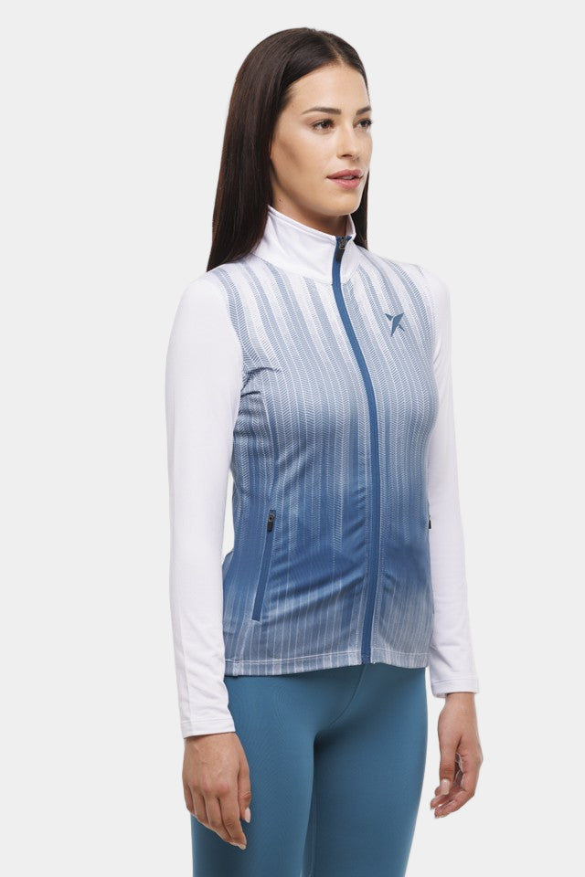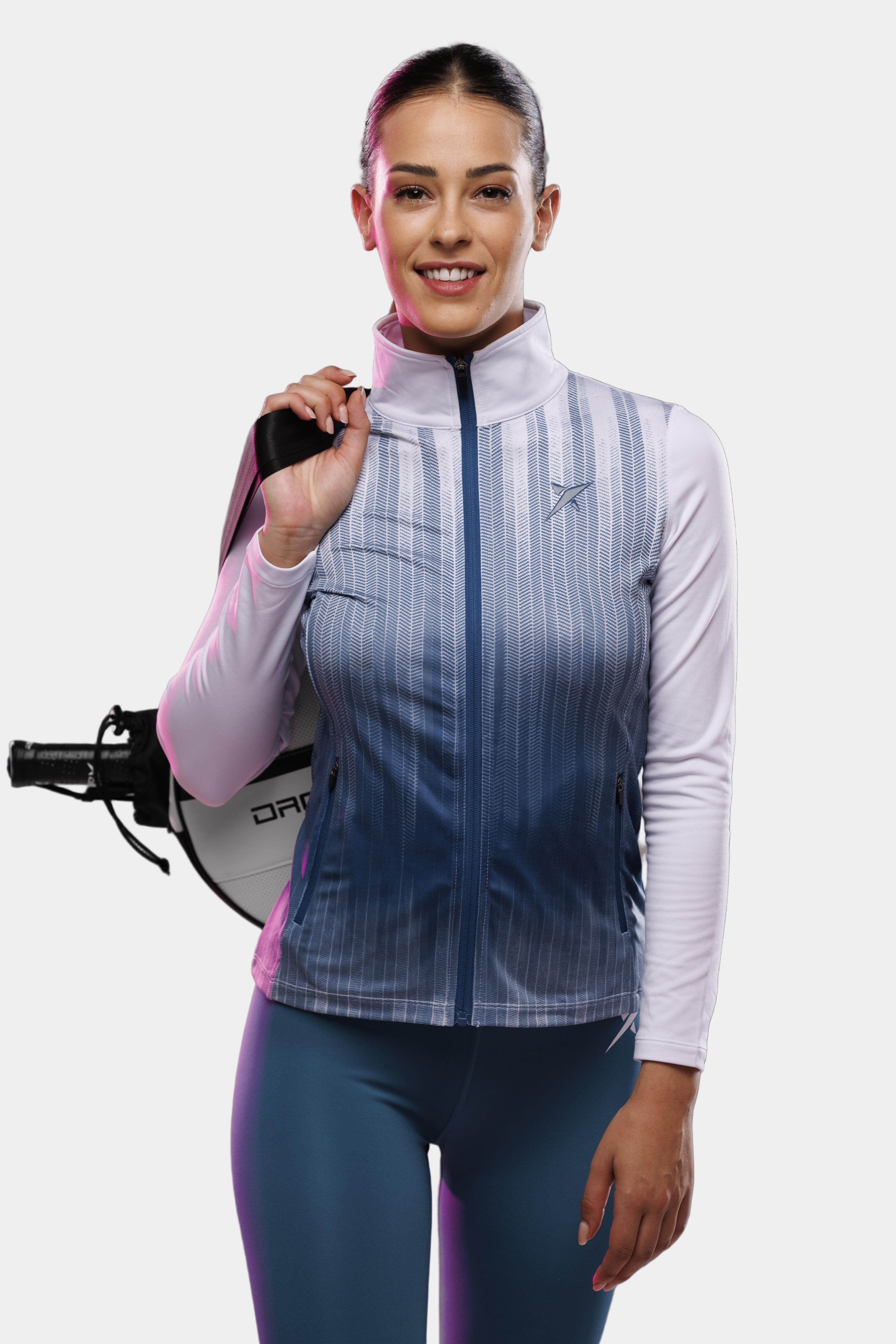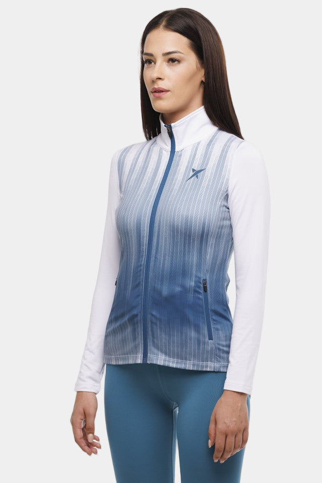 La Chaqueta Drop Shot Isora busca resaltar la personalidad de todas aquellas mujeres deportistas y competitivas que disfrutan del pádel. La prenda luce un degradado en tonos azules y blancos que reserva un espacio a los detalles azules de las cremalleras, y el logo y nombre de la marca impreso en silicona 3D