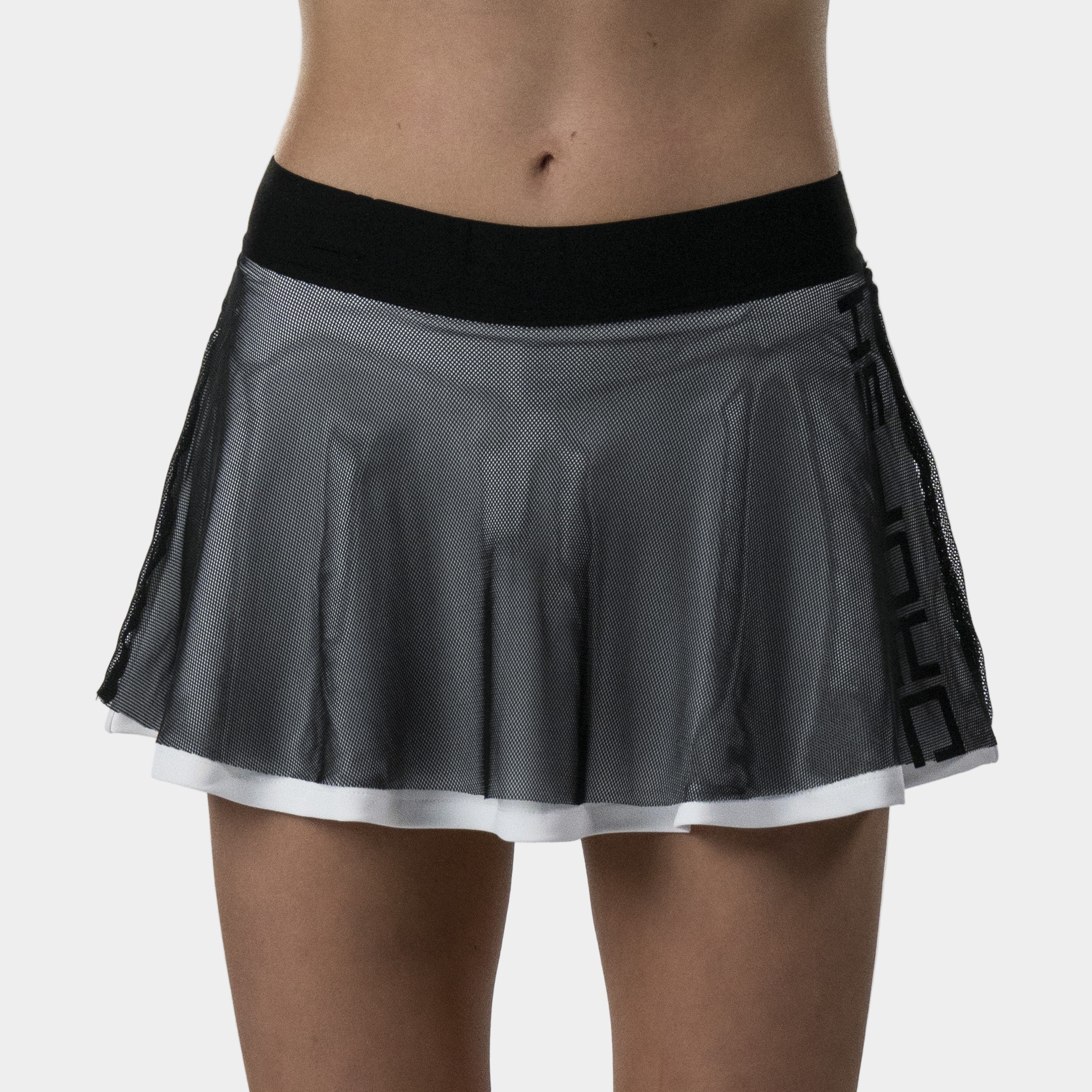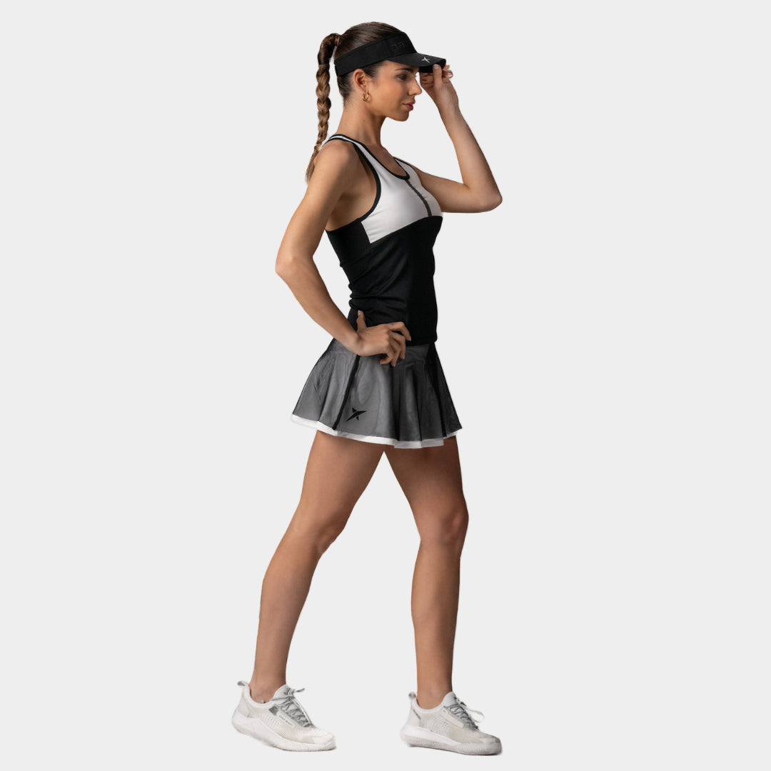 La falda interior luce discretamente el logo y nombre Drop Shot impreso en silicona 3D. Para el diseño de la sobrefalda nos hemos decantado por un tejido mesh en color negro que consigue un look chic y atemporal.