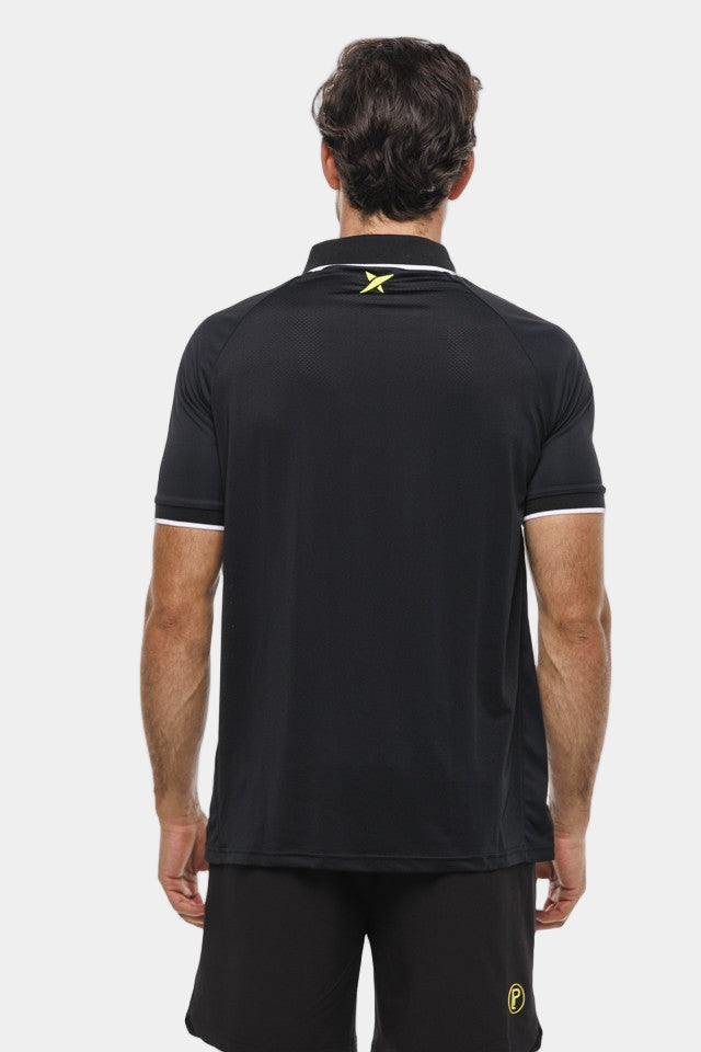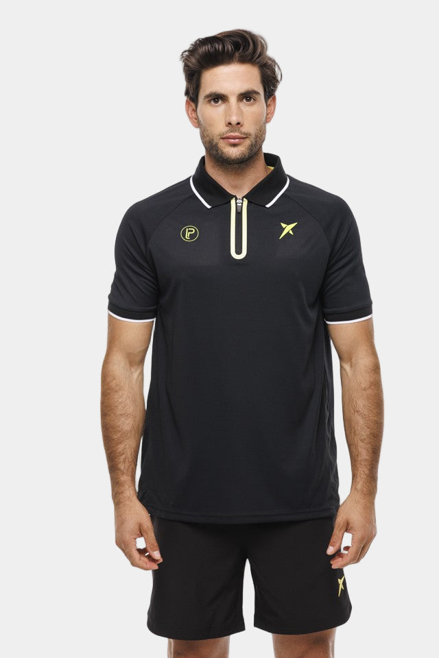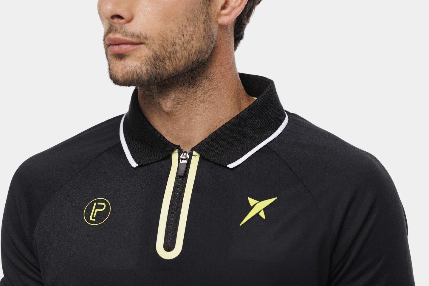 El Polo Drop Shot Rayco no solo destaca por su inigualable calidad, sino también por por su elegante diseño. La prenda ha sido confeccionada en un distinguido tono negro, combinado con detalles amarillos y blancos en el cuello y las mangas. Por último se remata con la impresión en 3D de l logotipo de la marca y de la línea LP