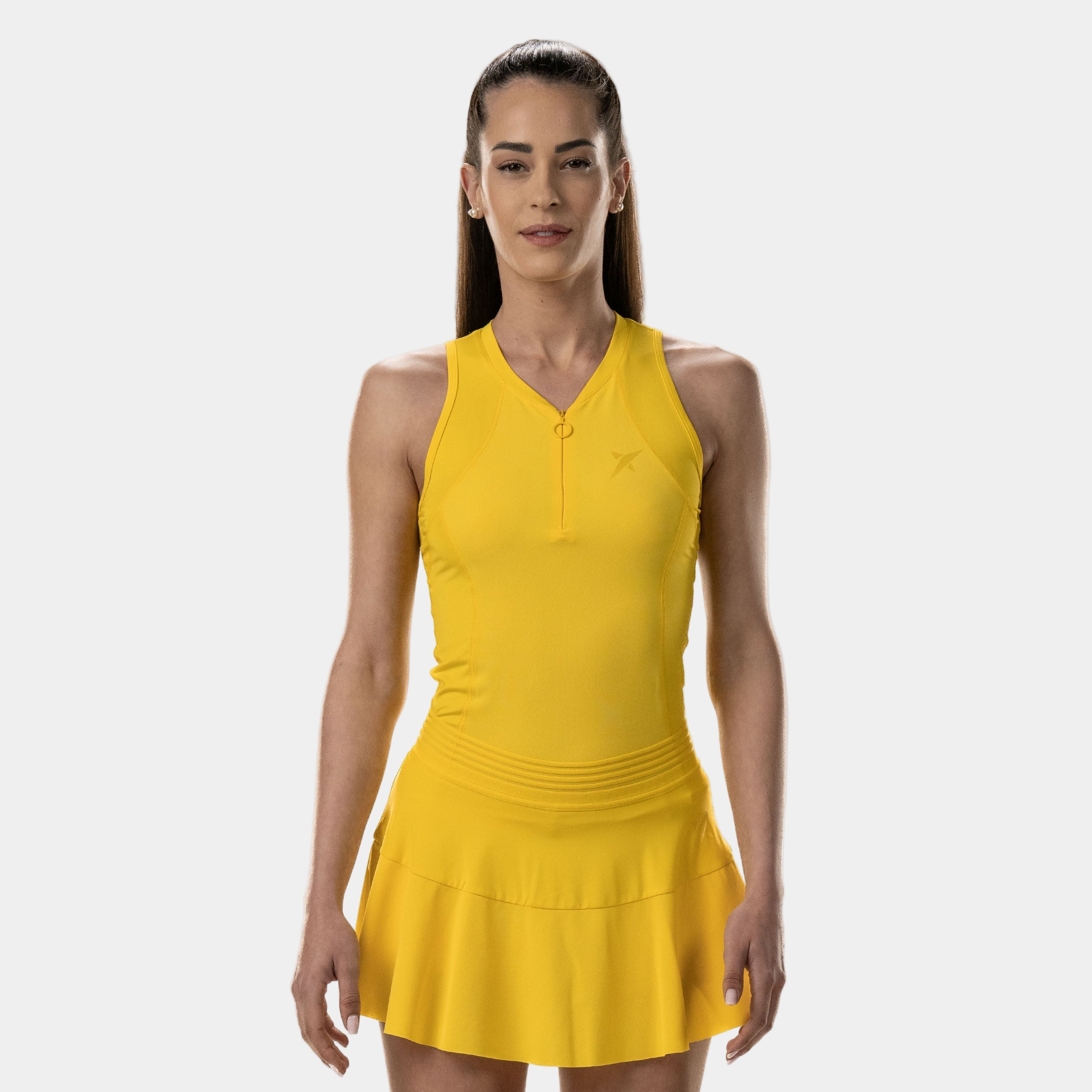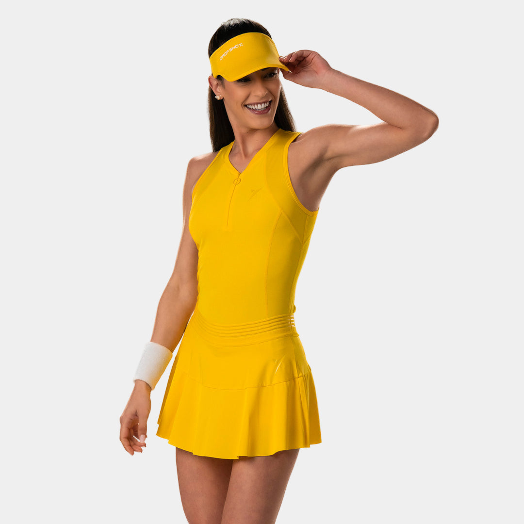 El Polo Drop Shot Sol luce un distinguido tono amarillo que ha sido pensado para aquellas jugadoras a las que le gusta arriesgar con sus outfits. Su corte estilo bañador resalta los hombros y la espalda, favoreciendo la figura. La prenda cuenta con una media cremallera, que además de proporcionar un extra de comodidad y frescura, añade un toque personal y único. El logo y nombre de la marca se imprime en el mismo tono a partir de la técnica Shiny Print, añadiendo valor y distinción.