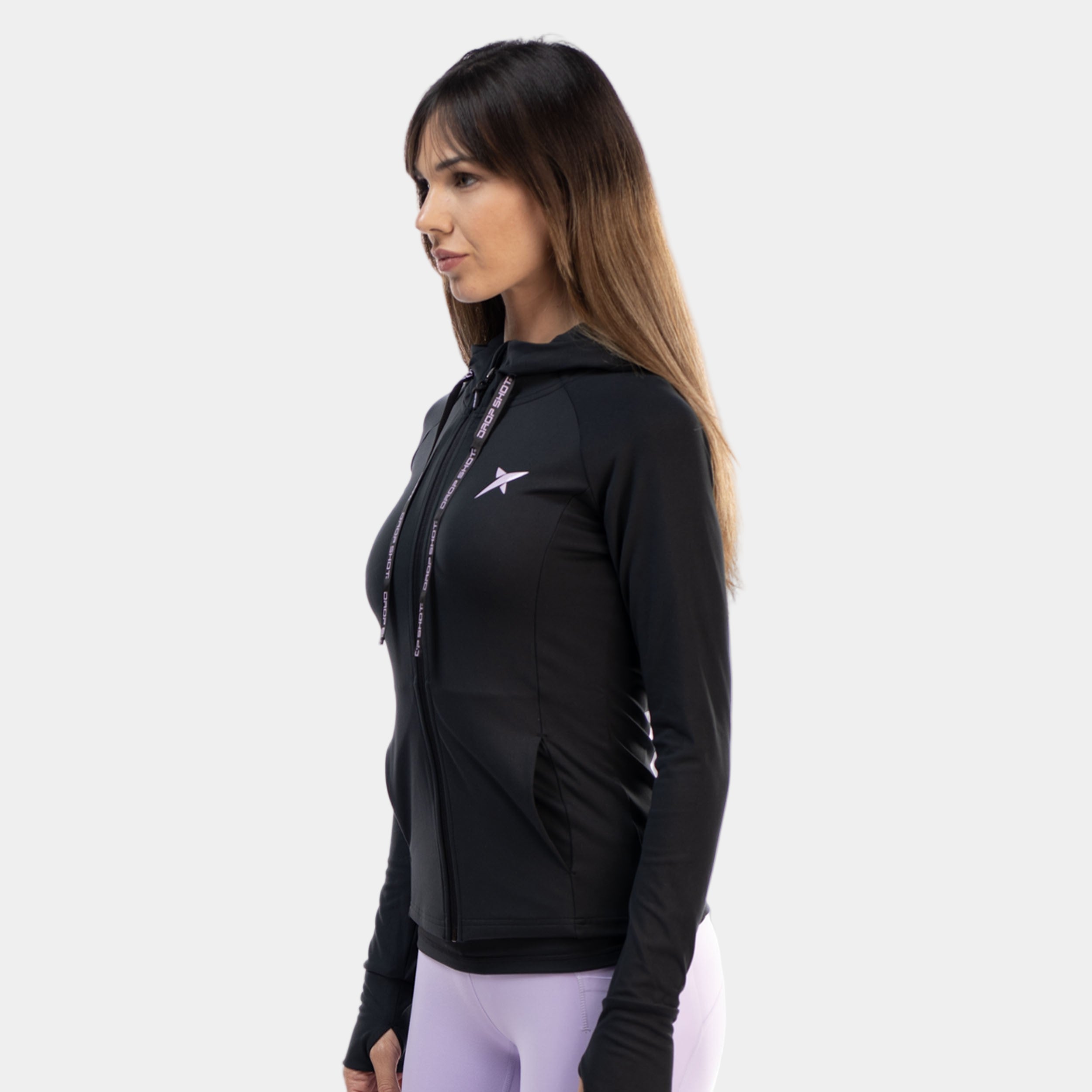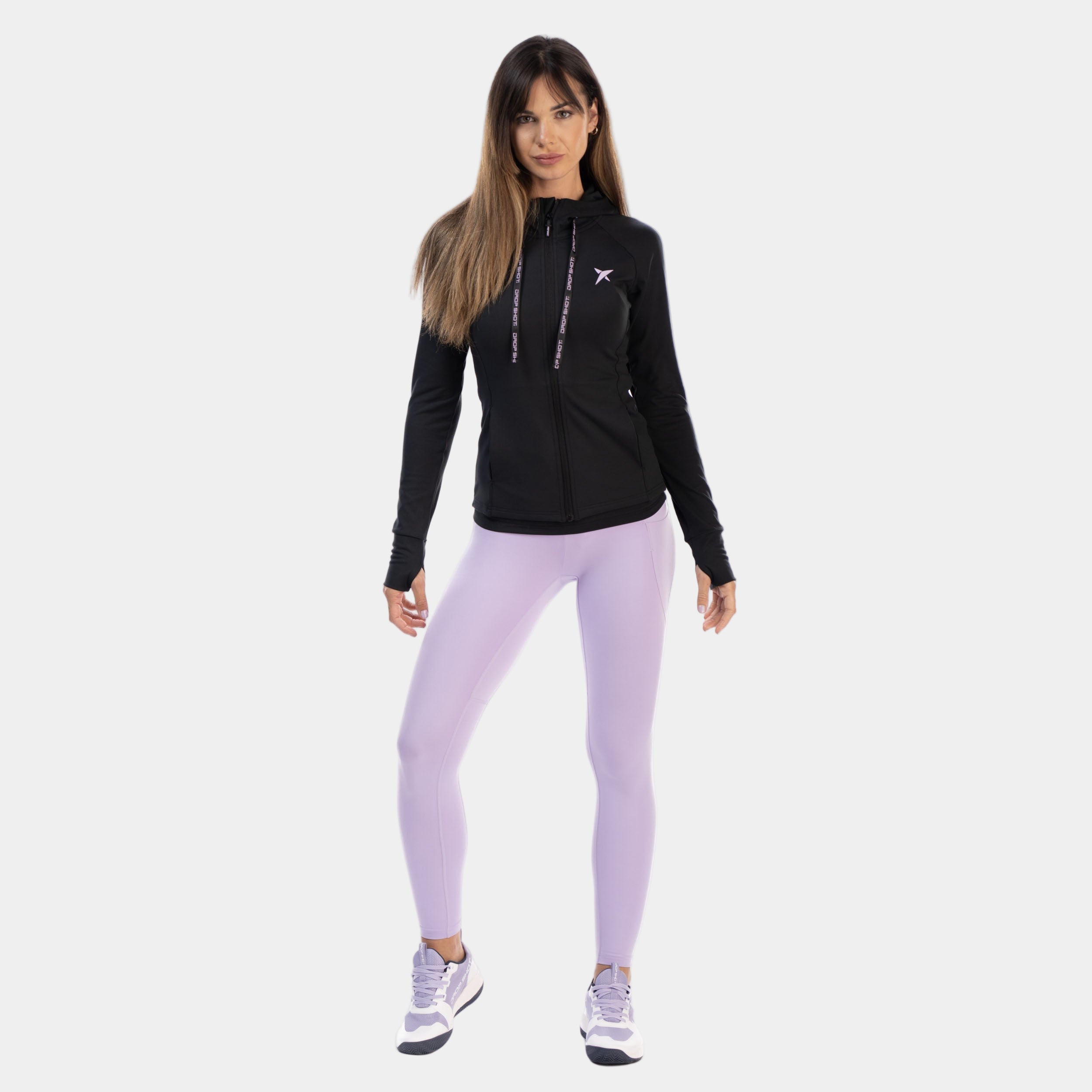 Para su diseño nos hemos decantado por el elegante y fácilmente combinable color negro; sobre el que destacan los detalles en color lila, a juego con el resto de la línea Dalia. Cuenta con una capucha regulable por cordones personalizados y una cremallera de arriba abajo. Los puños de sus mangas incorporan una apertura para poder dejar al descubierto el dedo pulgar y proteger así el resto de la mano del frio. La impresión del logo de Drop Shot en 3D rubber print aporta personalidad y carácter al diseño.