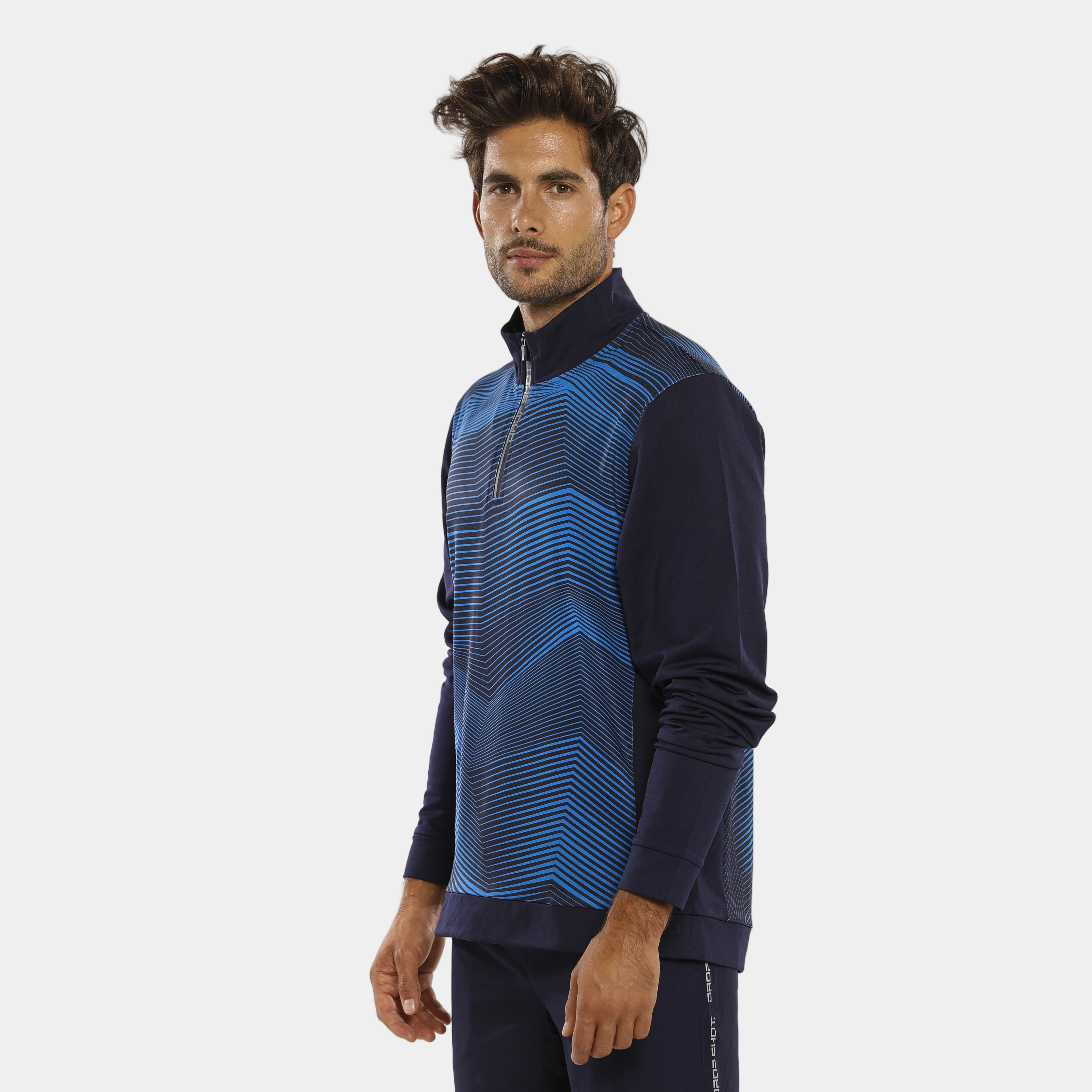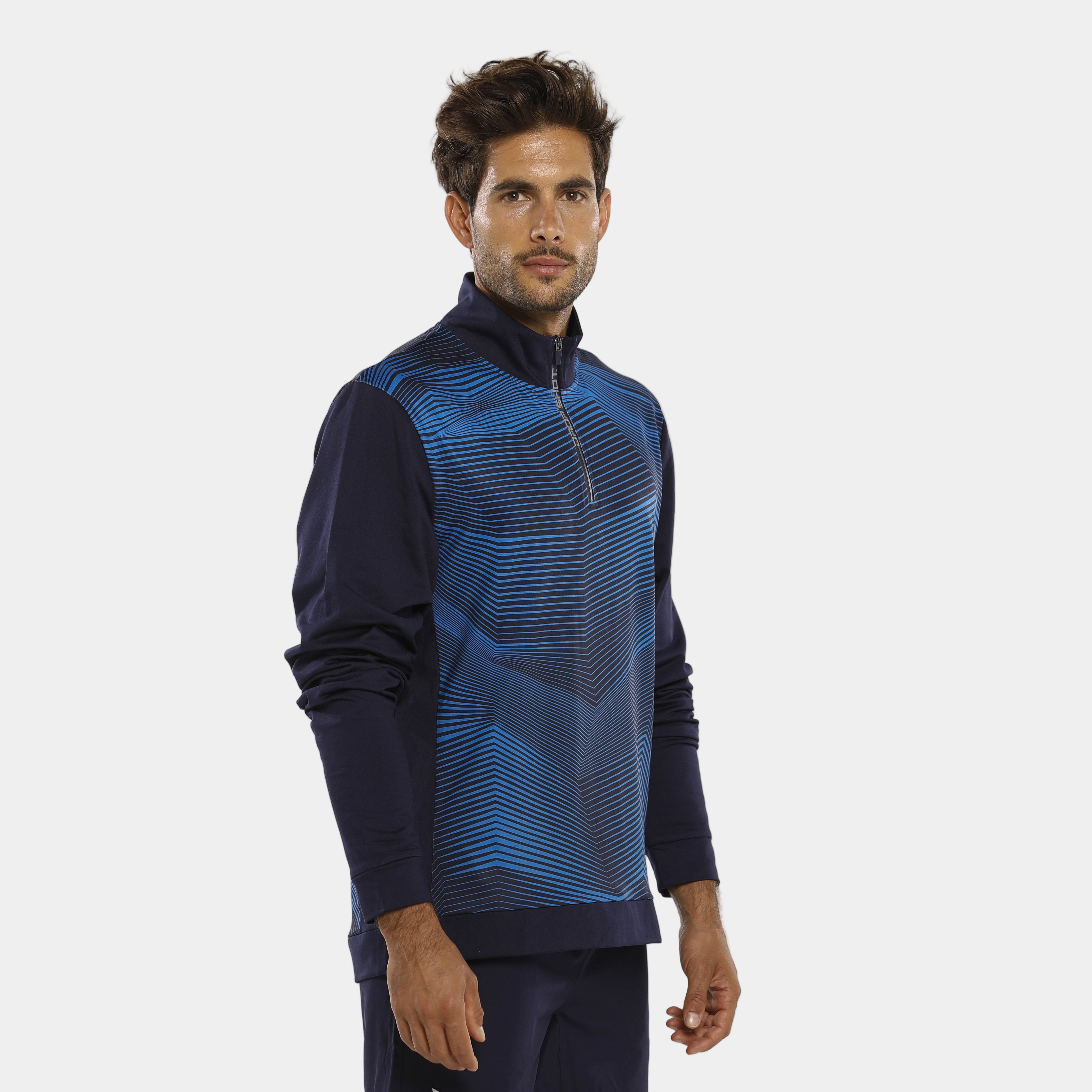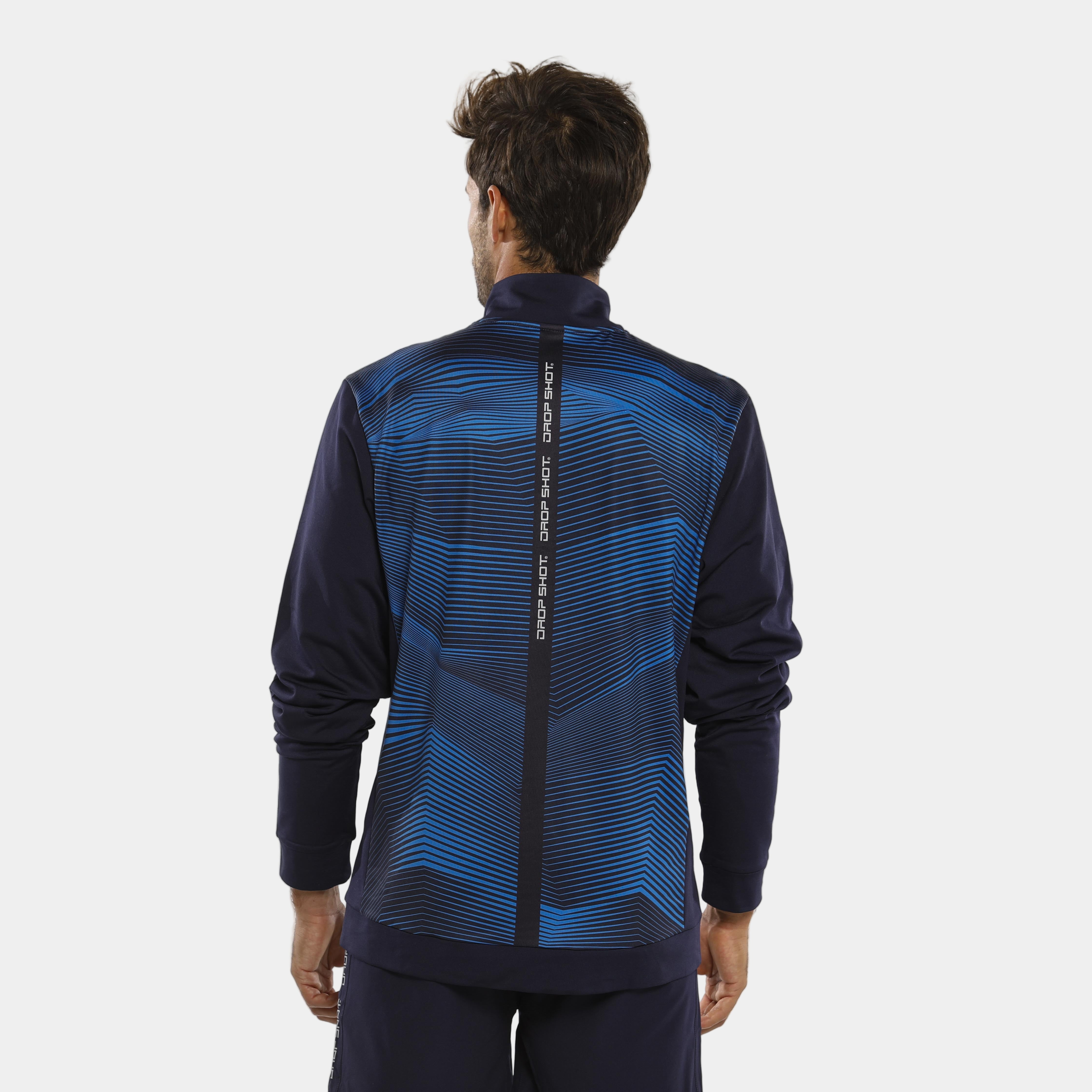 Una Sudadera Drop Shot Rush 2021 que, además, brilla por su elegante diseño donde las tonalidades azules se combinan creando líneas geometrizadas y dejando espacio a los detalles en blanco. Todo, con una cómoda concepción con media cremallera.